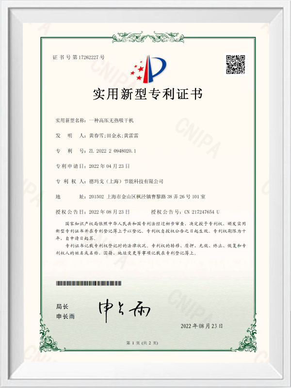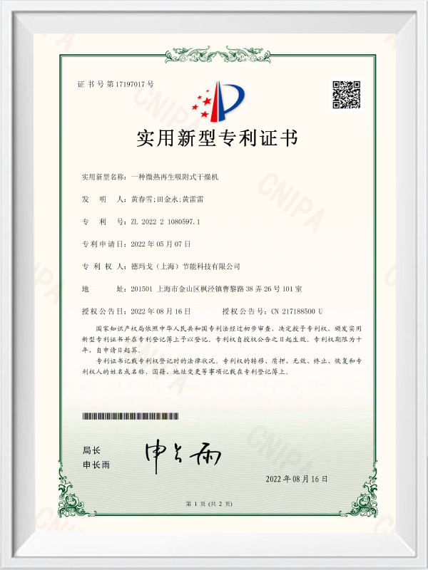 A Micro-scelerisque Regenerative Adsorption dryer, Utility Model patent certificatorium
